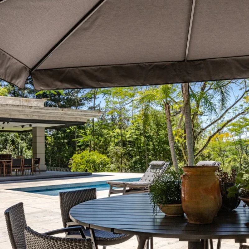 A construção do guarda-sol Verano, com seu mastro lateral, oferece um aproveitamento excepcional da área sob ele. Sua inclinação vertical proporciona a direção ideal da cobertura, assegurando uma sombra perfeitamente posicionada.