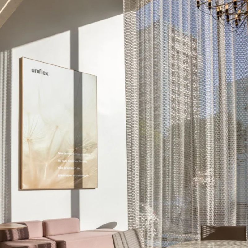 Produzida com uma mescla nobre de linho, viscose e poliéster, a coleção une beleza sensorial e alta durabilidade qualidades que refletem o padrão técnico Uniflex. As amarrações singulares criam efeitos de sombra e transparência que mudam ao longo do dia, convidando o olhar a desacelerar e observar os detalhes.
