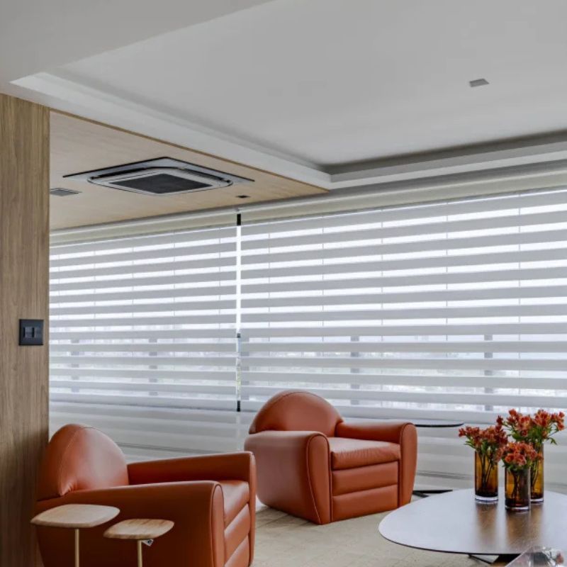 A Cortina Mystique Uniflex é mais do que um rolô duplo: é a arte de transformar a luz em experiência. Suas duas telas sobrepostas criam um movimento sutil, que alterna entre a transparência delicada e a privacidade absoluta. Basta um leve toque no cordão ou no controle remoto para que o ambiente revele uma nova atmosfera, em perfeita sintonia com o momento.