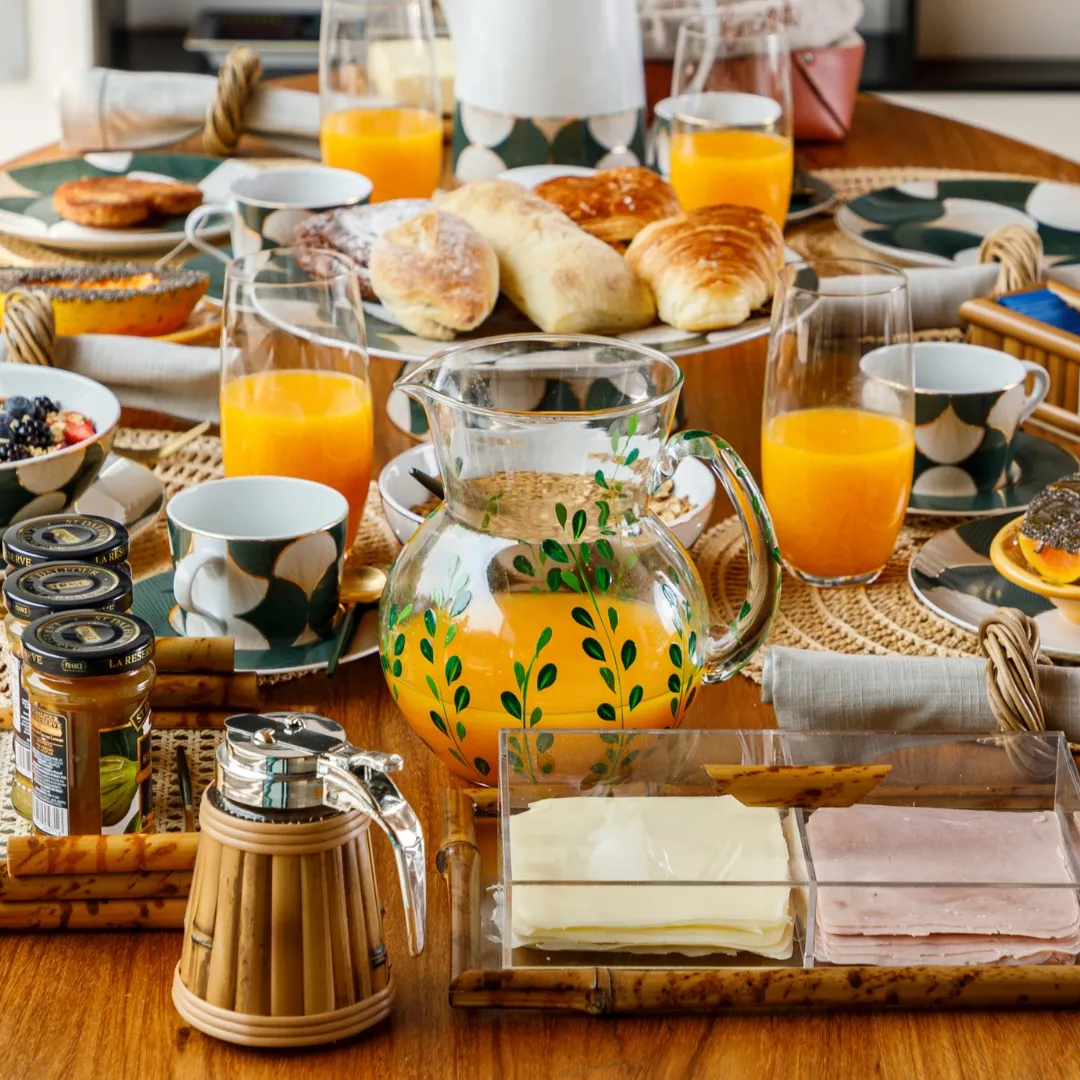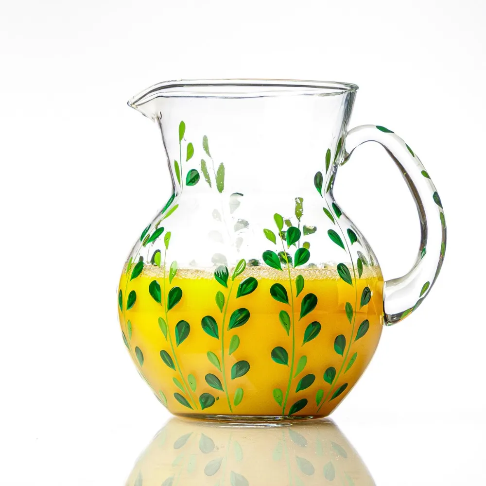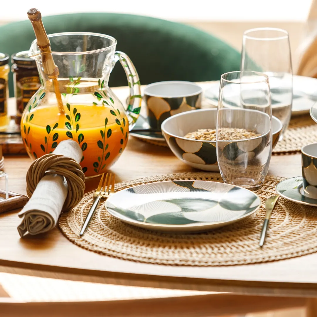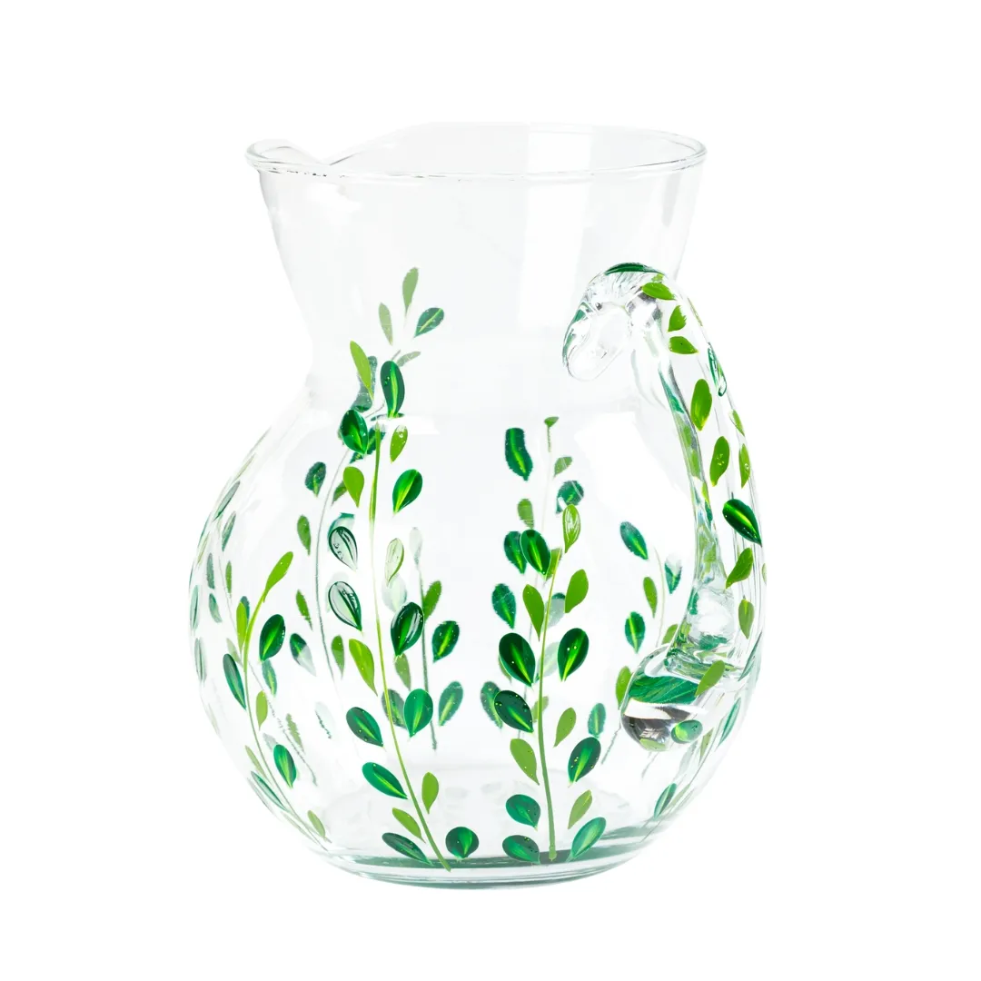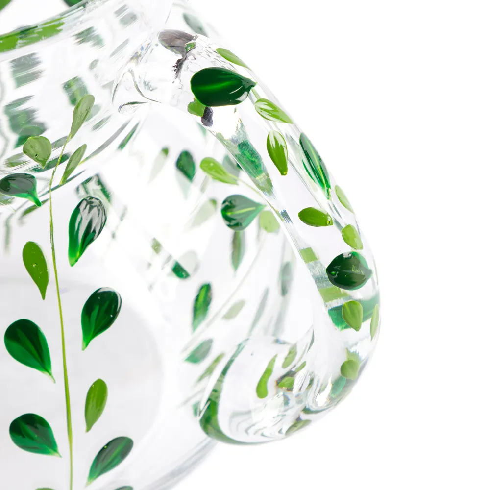 A coleção Leaf traz uma estampa de folhas em tons de verde, pintada à mão, que celebra a beleza natural em cada detalhe. A jarra em vidro, com traços delicados e acabamento artesanal, é perfeita para compor uma mesa charmosa e acolhedora. Acompanhada de dois modelos de taças e copo na mesma estampa, permite criar composições únicas e cheias de personalidade.