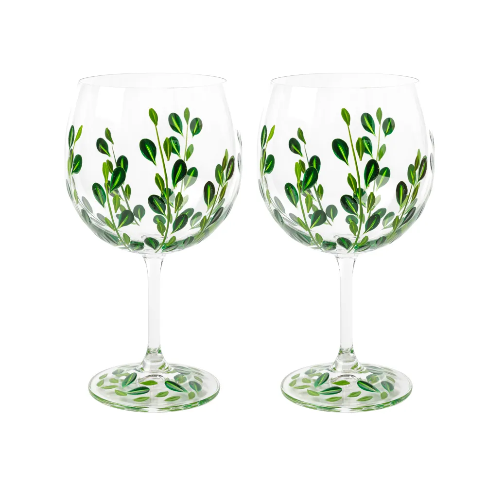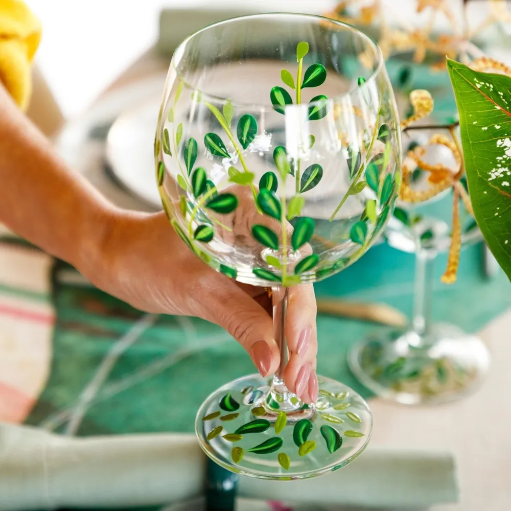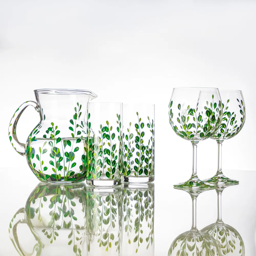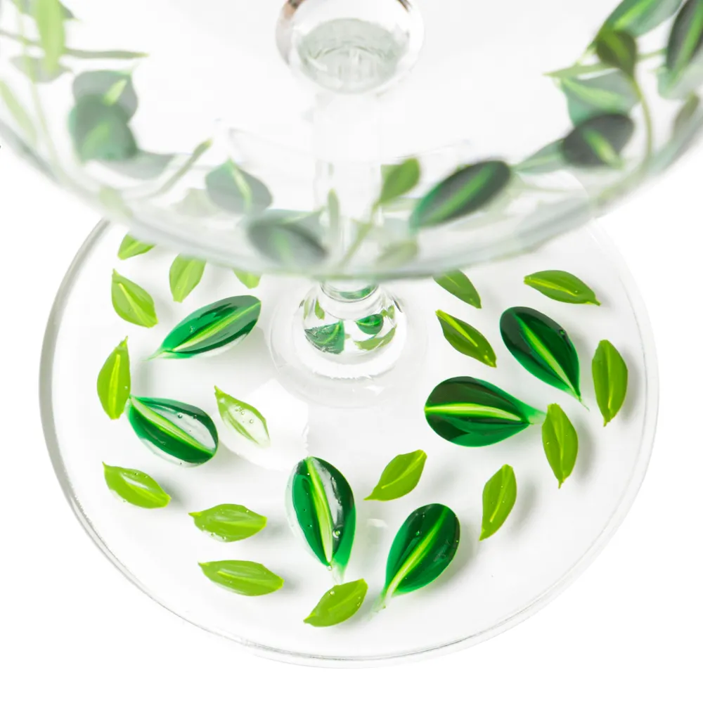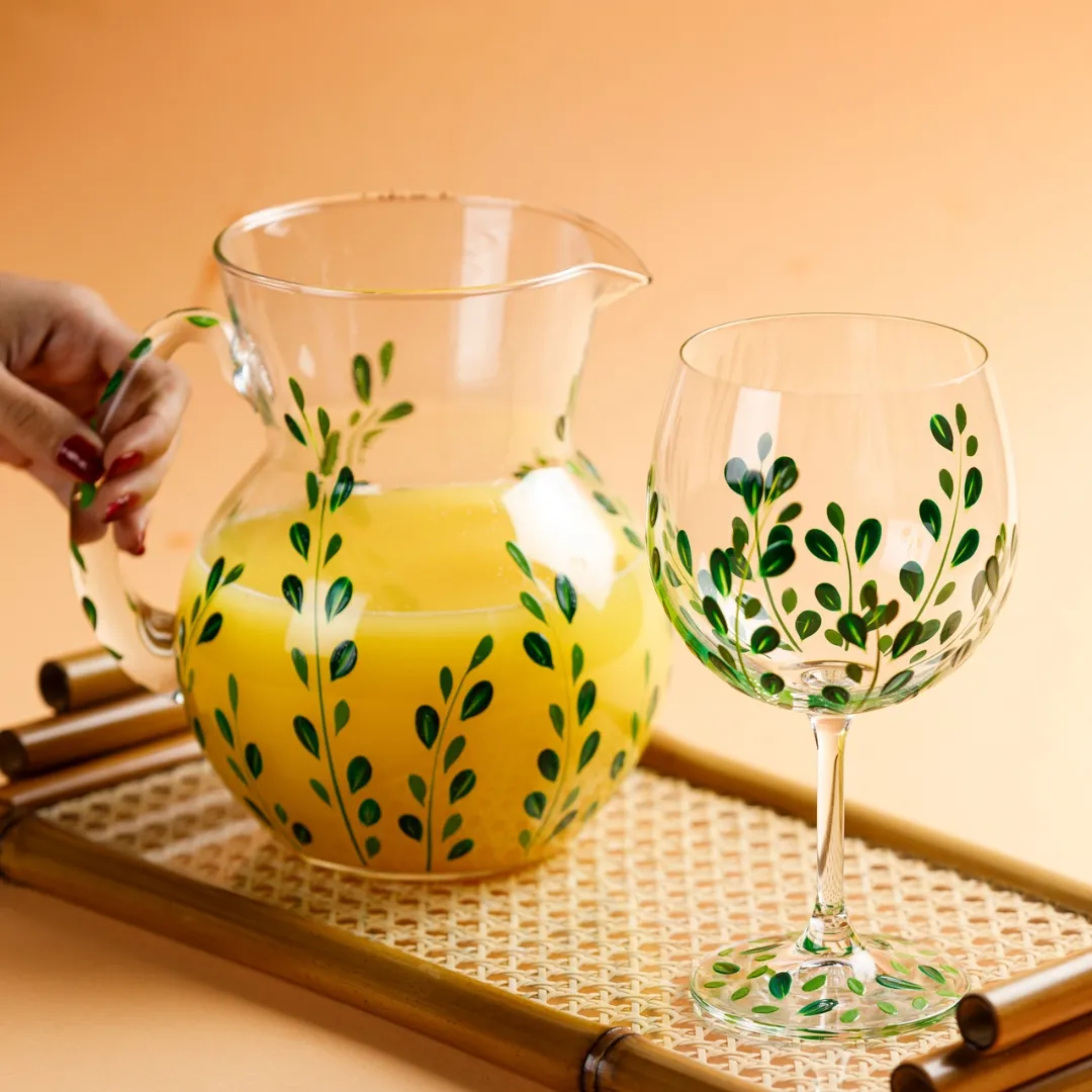 A coleção Leaf traz uma estampa exclusiva de folhas em tons de verde, pintada à mão, que celebra a beleza natural em cada detalhe. A taça em cristal com revestimento de titânio, com capacidade de 600 ml, une resistência e elegância, ideal para servir drinks, água ou refrigerante. A coleção é composta por uma linda jarra, copo e mais um modelo de taça na mesma estampa.