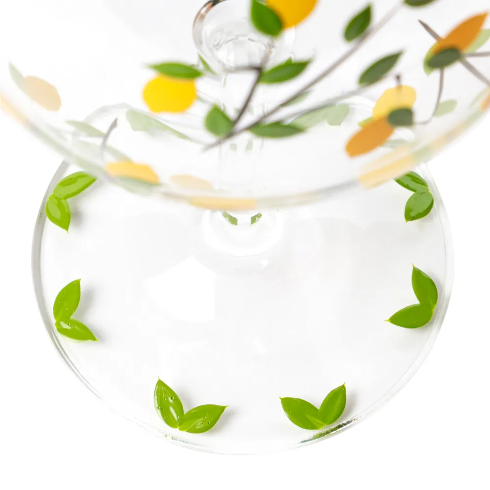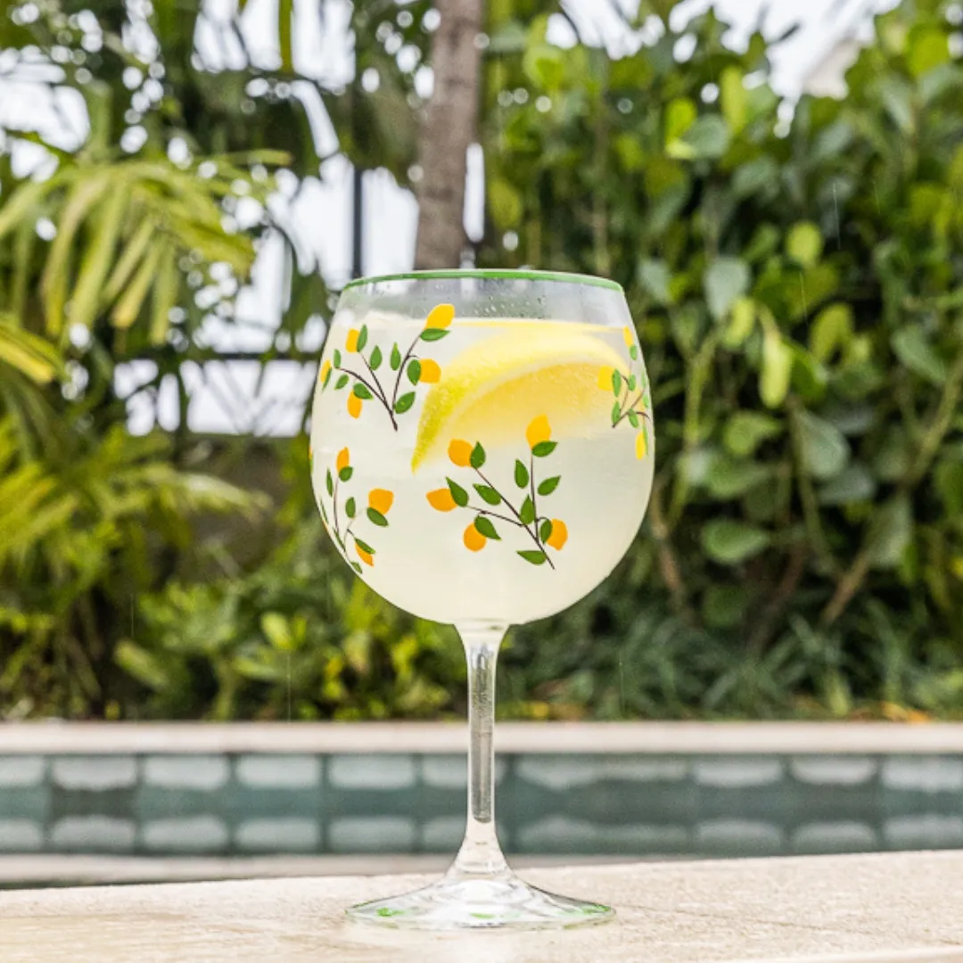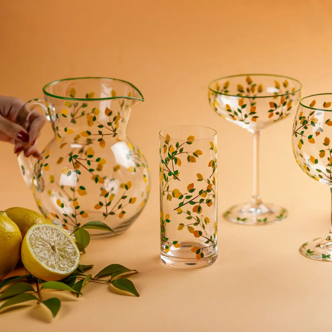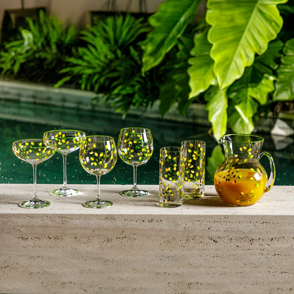 A coleção Limone é inspirada na essência vibrante dos limões sicilianos, com estampa delicadamente pintada à mão. A taça em cristal com revestimento de titânio, com capacidade de 600 ml, é ideal para ideal para servir drinks, água ou refrigerante, trazendo o frescor do Mediterrâneo à sua mesa. A coleção possui mais um modelo de taças, jarras e copos para composições variadas.
