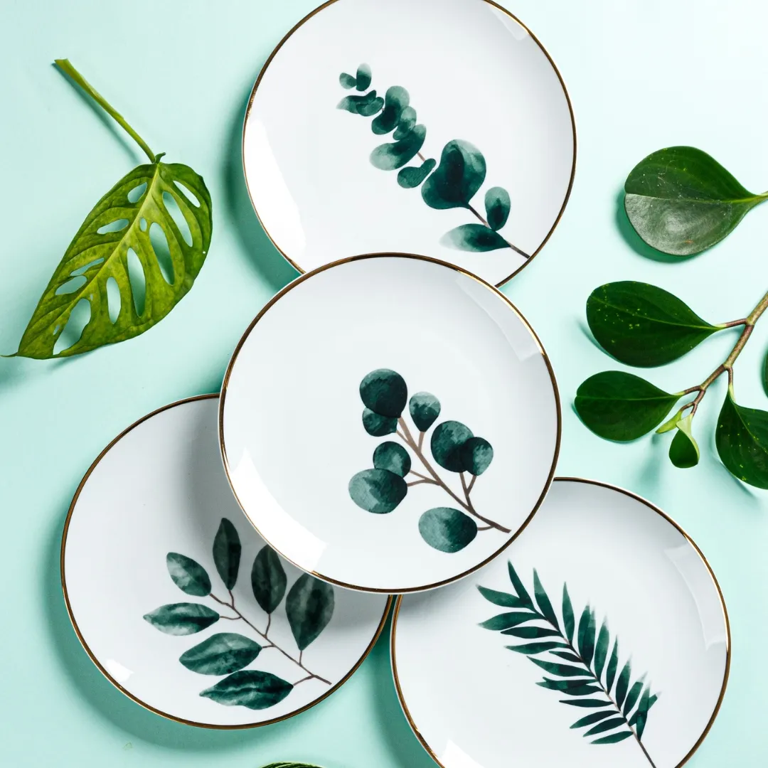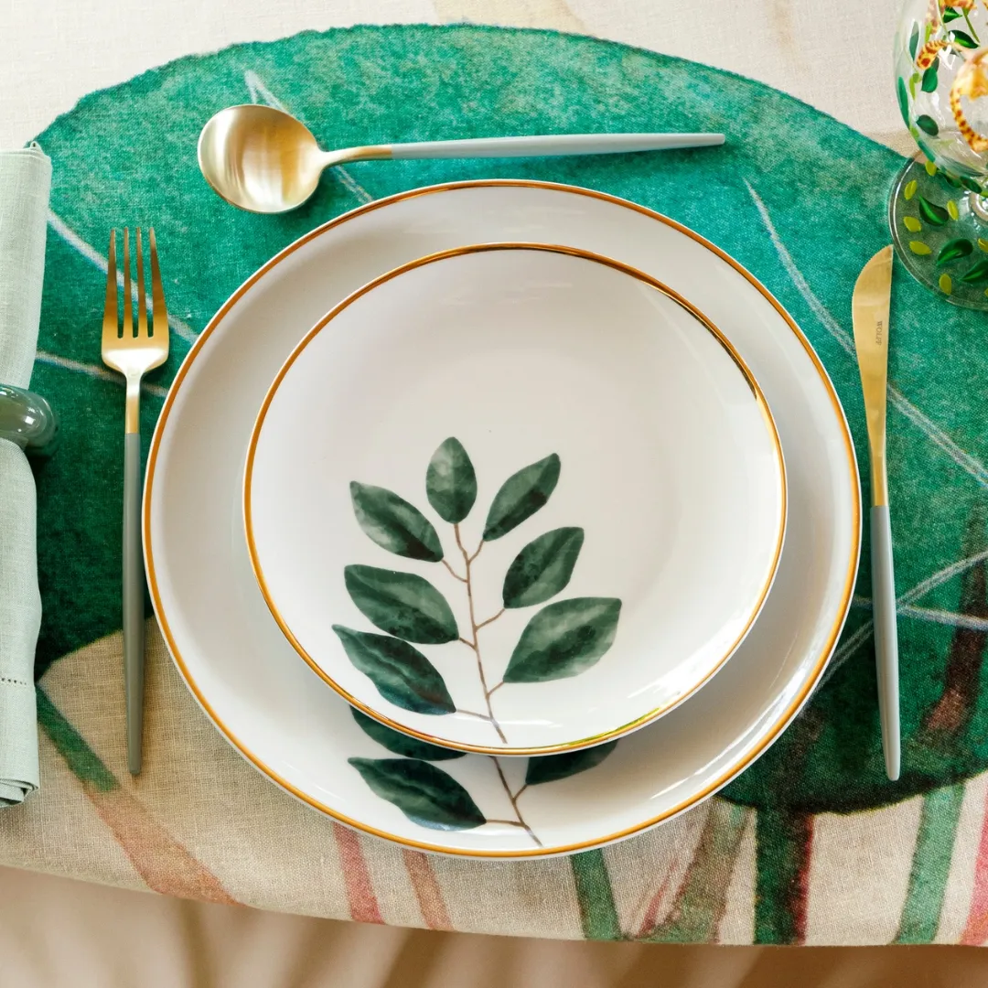 O prato de sobremesa Leaf é feito em porcelana portuguesa, com estampa de folhagem em verde e com filete de ouro na borda. A escolha ideal para servir entradas e sobremesas com charme e elegância, além de ter um tamanho perfeito para sua mesa de café da manhã/tarde.