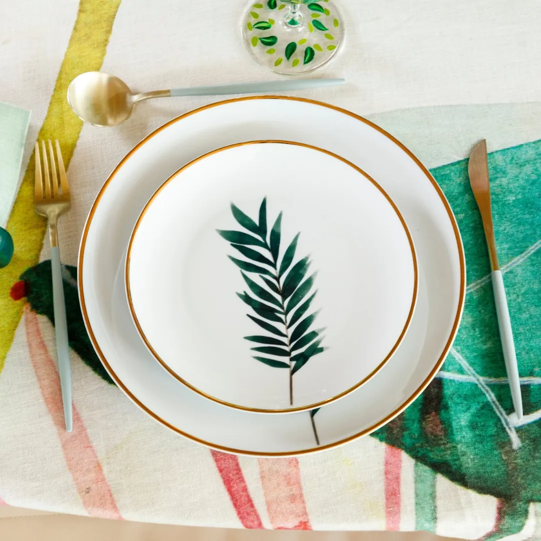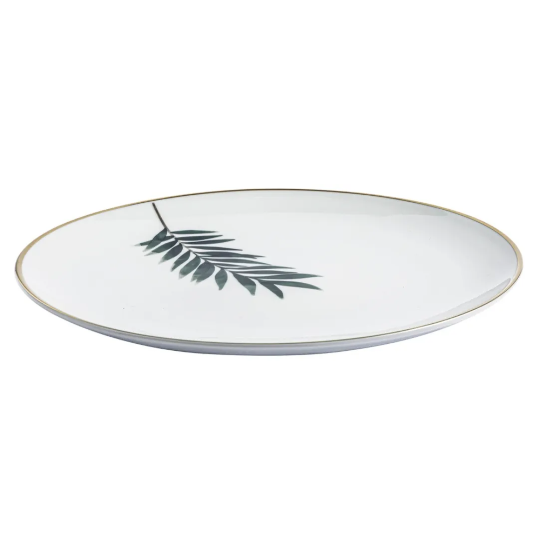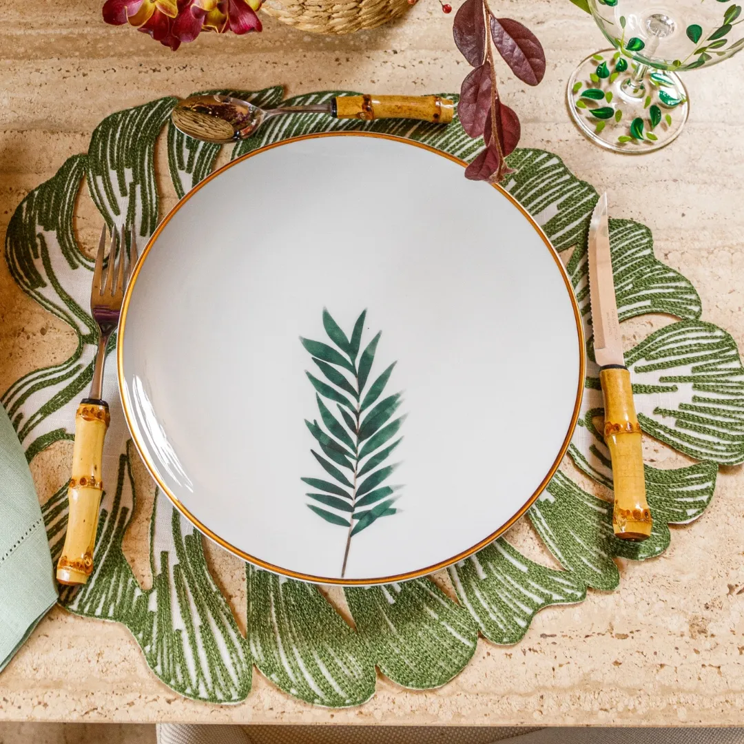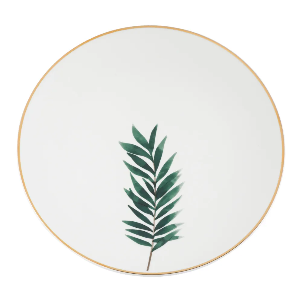 O prato raso Leaf apresenta uma estampa de folhagem em tom verde complementado por um refinado acabamento em filete de ouro na borda. Ideal para refeições do dia a dia e indispensável para o enxoval da sua casa por ser atemporal.