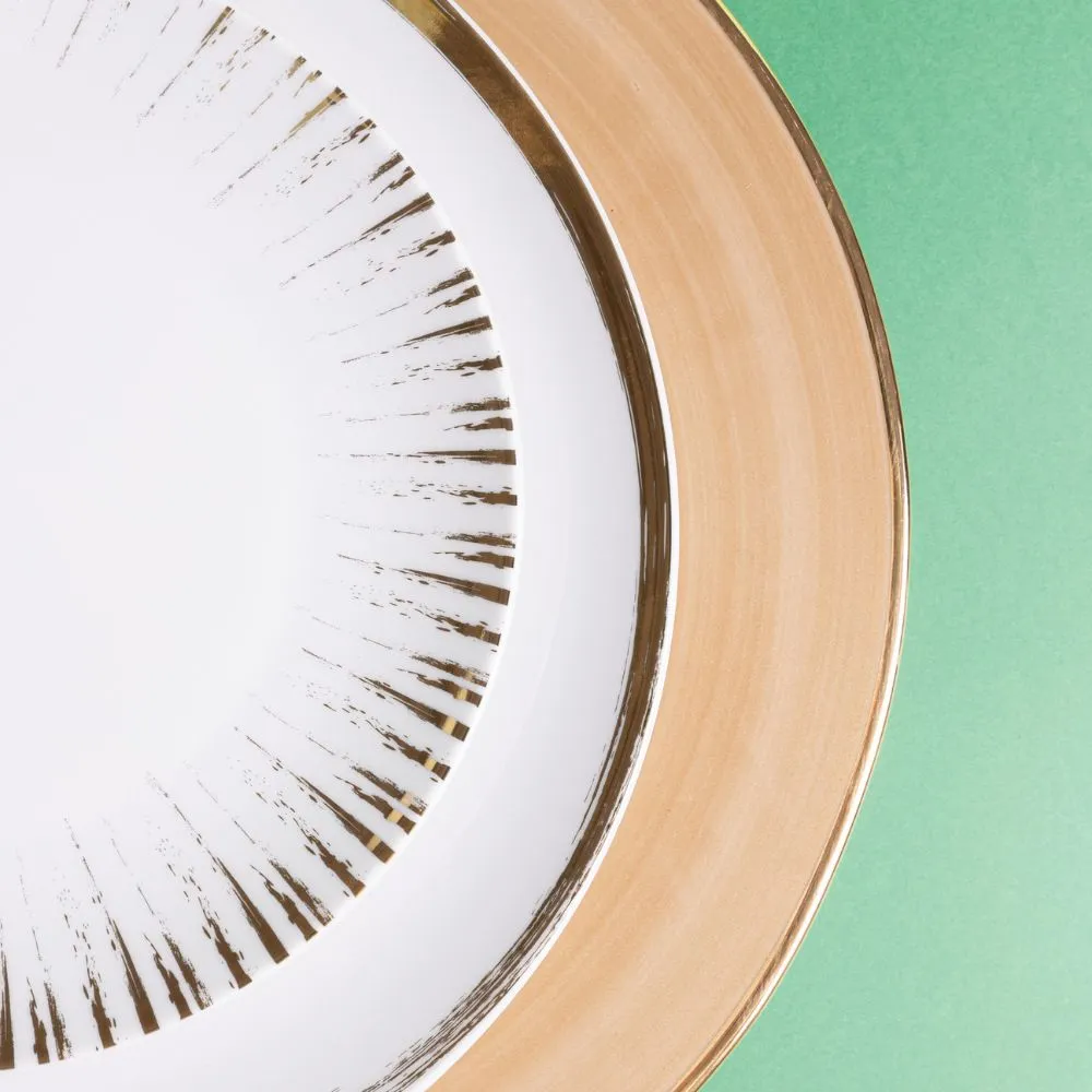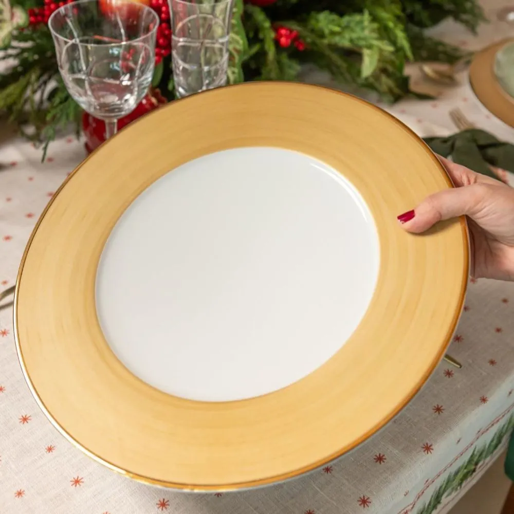 O Sousplat Golden é feito em Porcelana Portuguesa, da tradicional casa SPAL, reconhecida por mundialmente por criar obras de arte em louças e pela sua durabilidade. Tem a sua borda toda pintada de ouro, dando um toque de elegância e sofisticação para qualquer mesa. Versátil e elegante, harmoniza perfeitamente com qualquer estilo de mesa, tornando cada ocasião ainda mais especial.