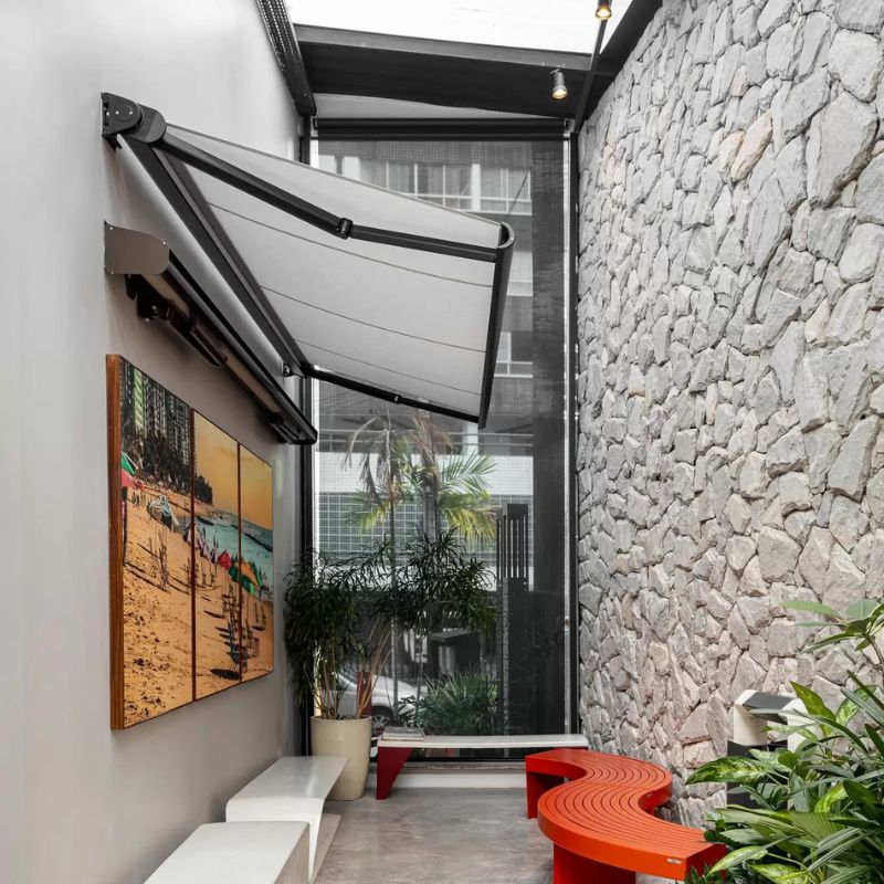 Quando recolhido, sua barra frontal fecha completamente o toldo, protegendo o tecido e os braços articulados contra chuva e sujeira, garantindo assim maior durabilidade, podendo até mesmo servir como elemento decorativo.