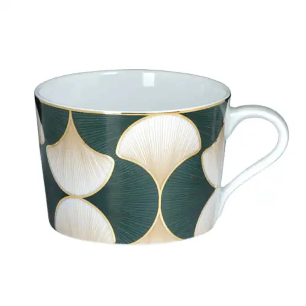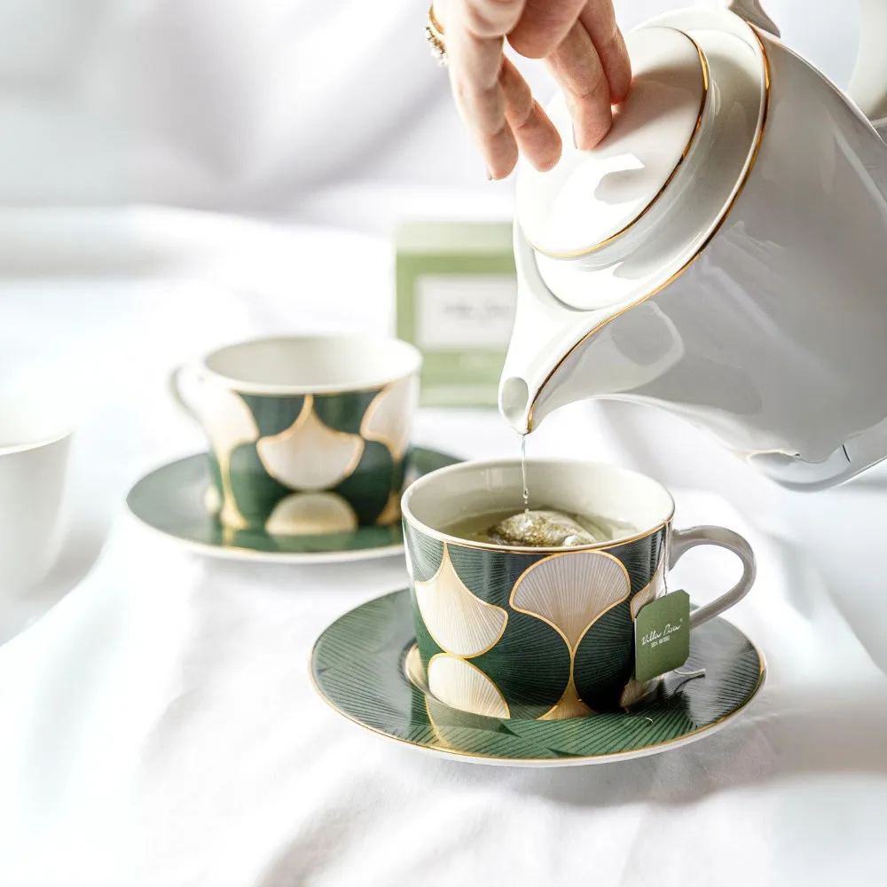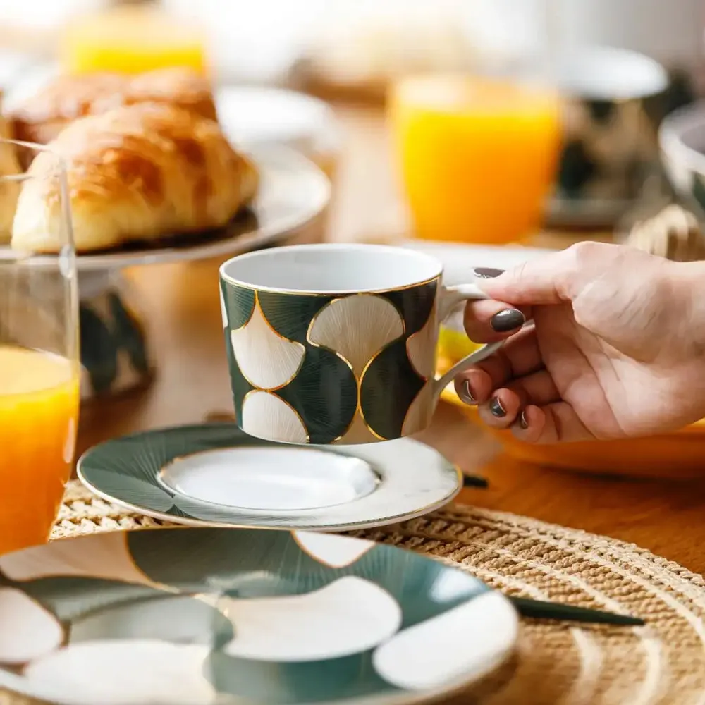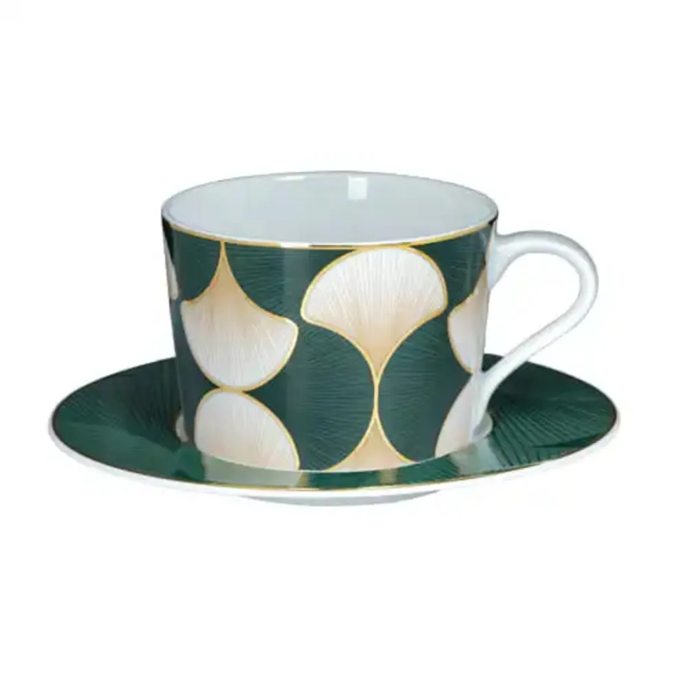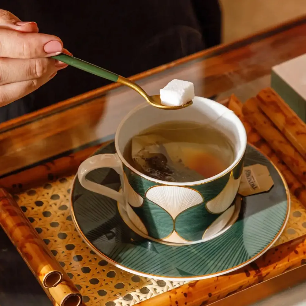 Feita em porcelana portuguesa com filetes de ouro, a xícara de chá Folhas de Gingko é ideal para servir chá, chocolate quente ou café. A coleção, produzida pela fábrica Spal Porcelana, é inspirada na simbólica folha de Gingko, um tributo à longevidade e à beleza resiliente da natureza.